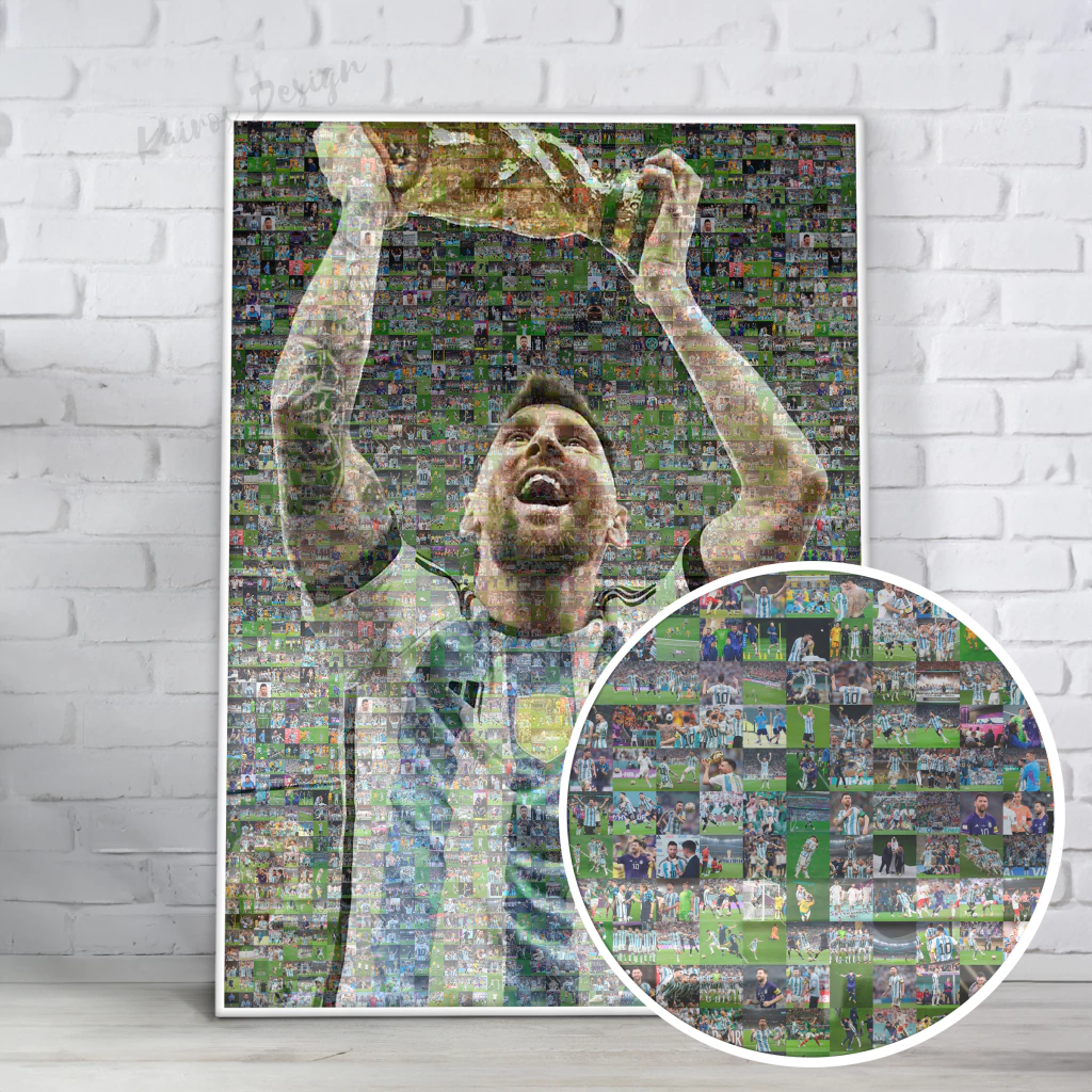 Esta armado con más de 1.000 fotos distintas de Messi grupales e individuales del mundial.
